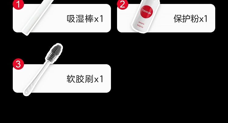 內容:1. 吸潔棒 (1支);2. 保護粉 (1瓶);3. 軟膠刷 (1支)